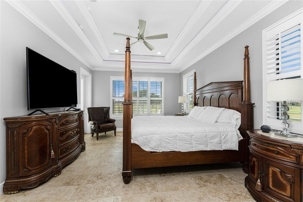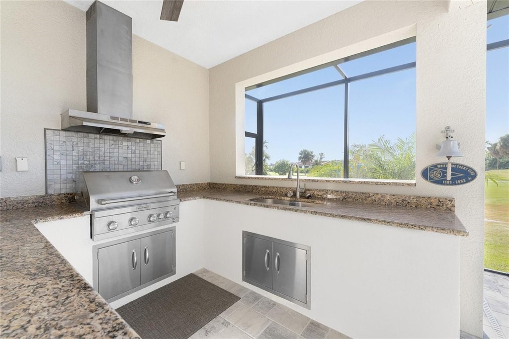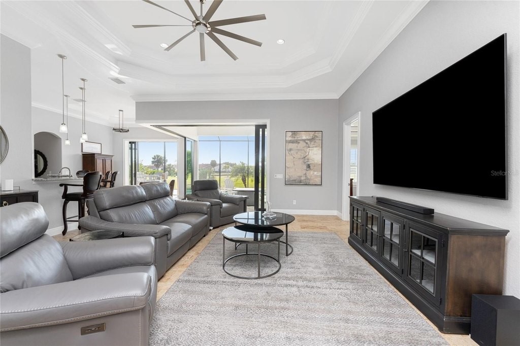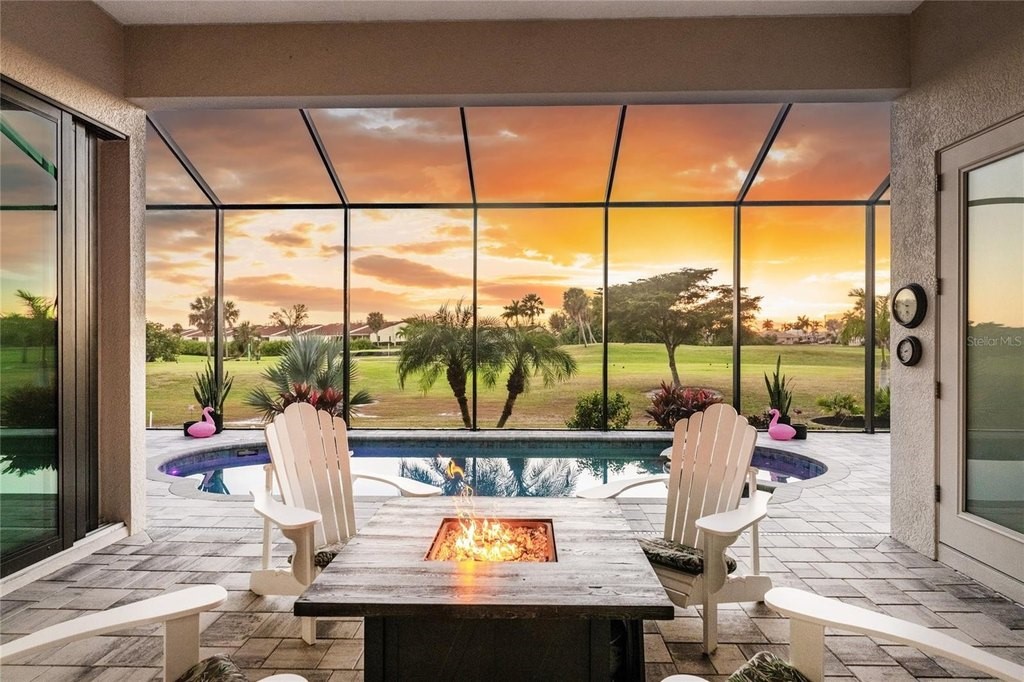 This beautiful custom crafted home offers the perfect blend of style, quality, and effortless indoor-outdoor living, set on an oversized lot overlooking the eighth fairway of the private St. Andrews South Golf Club. Built in 2018, the home welcomes you with soaring thirteen foot ceilings, tile flooring throughout, elegant architectural details, and abundant natural light. The open great room showcases a striking double tray ceiling and flows seamlessly into the gourmet kitchen, featuring rich wood cabinetry, granite countertops, GE stainless steel appliances, and a sunlit sitting or dining area. Expansive disappearing and zero-corner glass doors erase the boundary between indoor and outdoor living, opening the space for relaxed living and entertaining. The spacious primary suite features a double tray ceiling, two walk-in closets, and a luxurious ensuite bath with a soaking tub, walk-in shower, and dual-sink wood vanity topped with granite. Two generously sized guest bedrooms are nicely paired with beautifully appointed bathrooms highlighting wood cabinetry and granite countertops, including a convenient pool bath - perfect for hosting family and guests in comfort and style. A refined and versatile office or den offers an ideal retreat for working from home, enjoying media, or quiet time alone. Step outside to your private oasis, where a sparkling pool and spa is surrounded by new brick pavers, lush tropical landscaping, and an expansive lanai complete with a fully equipped summer kitchen featuring a built-in grill, sink, and refrigerator-perfect for year-round entertaining. Enjoy morning coffee or unwind with an evening cocktail while watching golfers pass along the picturesque fairway. Additional features and enhancements include a new 2025 barrel tile roof with transferable warranty, crown molding throughout, plantation shutters, hurricane-impact windows, a recently enlarged brick-paver driveway, a 3-car garage with epoxy-finished flooring, new lighting fixtures and ceiling fans, new pool mechanicals in 2025, professionally painted in 2025 and no HOA or fees. Bright, open, and impeccably maintained, this exceptional home is designed for both everyday comfortable living and memorable entertaining.